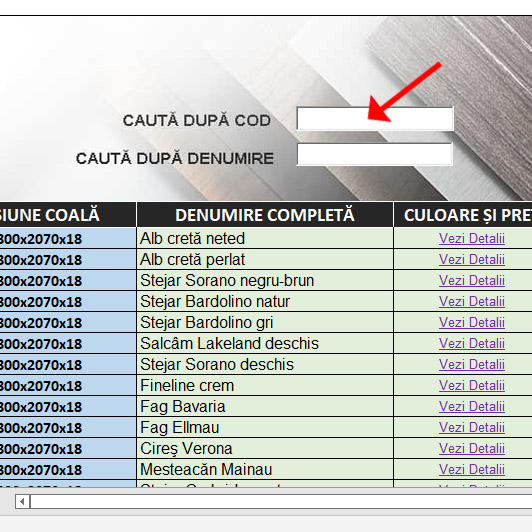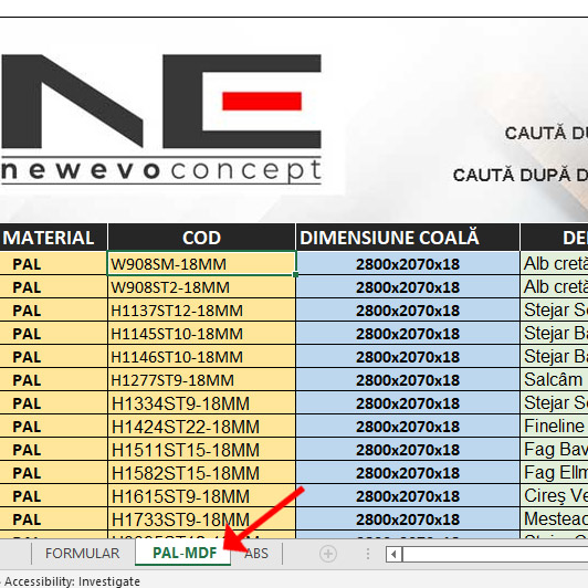 „ PAL/MDF”. Pentru identificare facilă, nu ezitați să utilizați celulele de căutare rapidă. – Pentru a copia codul unui material vom selecta celula dorită prin dublu click și folosim comanda CTRL + A (selectează tot din celulă) și CTRL+C (Copiază tot din celula). Odată copiat, se poate lipi în celula dorită folosind comanda rapidă CTRL+V (lipește tot ce este copiat). Comanda CTRL+V se poate folosi de câte ori este necesar să lipiți ultima celulă copiată. Lungimea, Lățimea și Numărul de bucăți se completează după necesitate.