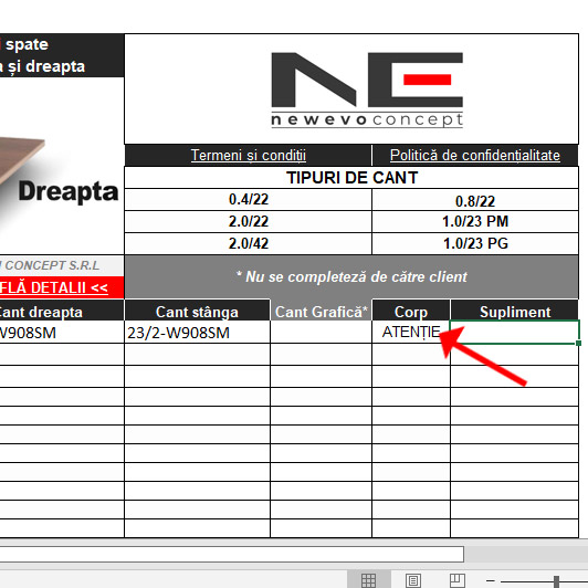 În coloana „Corp” se va introduce numărul subansamblului din care face parte placa. În cazul în care există particularitați precum cant de diferite grosimi, culori, dublaje plăci atunci coloana „Corp” se notează cu textul „ATENȚIE” „RETĂIERE” sau „DUBLAJ” respectiv în cazul RETAIERILOR, la coloana „SUPLIMENT” se notează cota de RETĂIERE a plăcilor sau CNC.