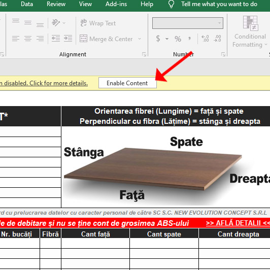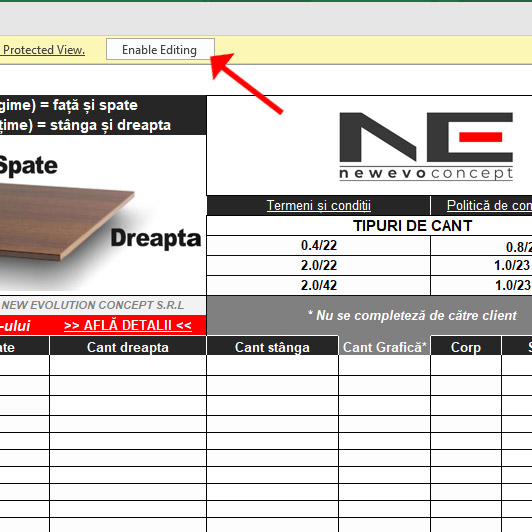 Programul Microsoft Excel de obicei deschide fișierele în modul de vizualizare. Pentru a reuși să editați formularul este nevoie să îl deblocați apăsând pe butonul „Enable Editing” totodată, pentru că am folosit un motor de căutare în formular, este necesar să activați conținutul apăsând pe butonul „enable content”.